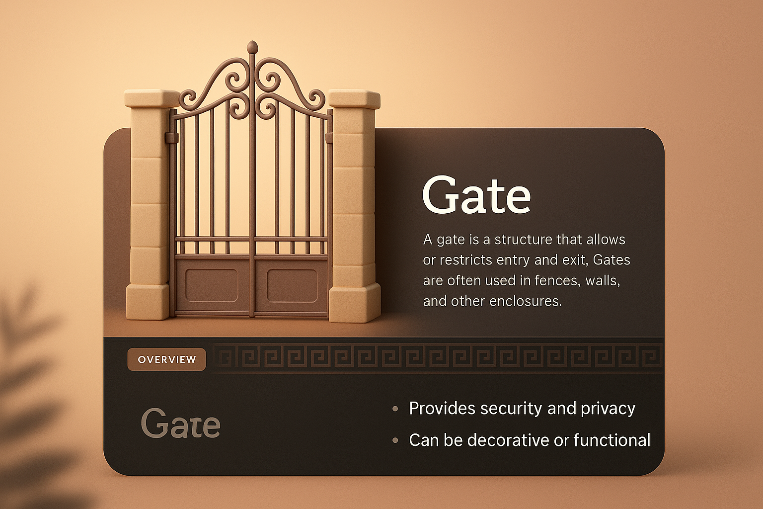 /Collection: /by davooda/Type: PNG/A stylish 3D illustration of a gate integrated into a web page layout. The design features a gradient background, descriptive text, and a decorative label, emphasizing functionality and aesthetics.