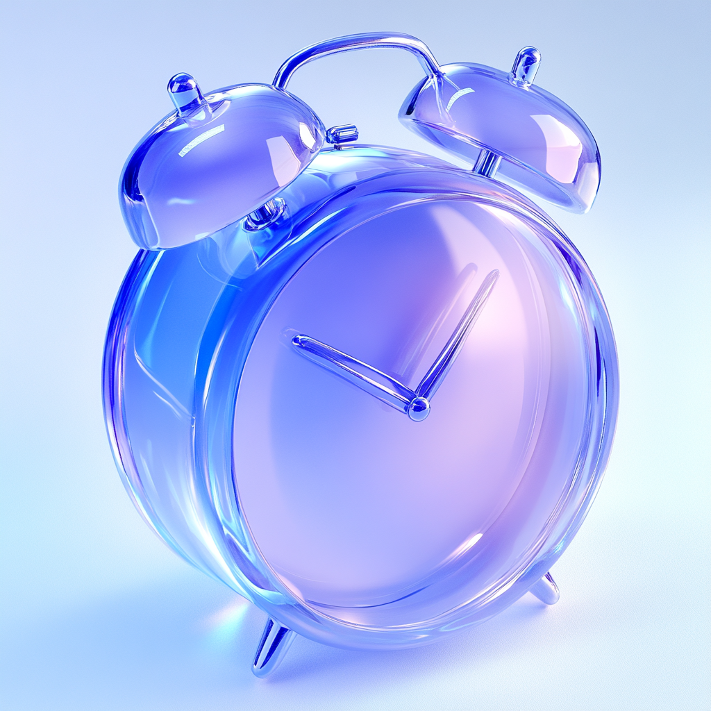 A visually striking 3D render of a modern alarm clock featuring a translucent design with soft blue and purple hues. Ideal for time management themes and lifestyle content.