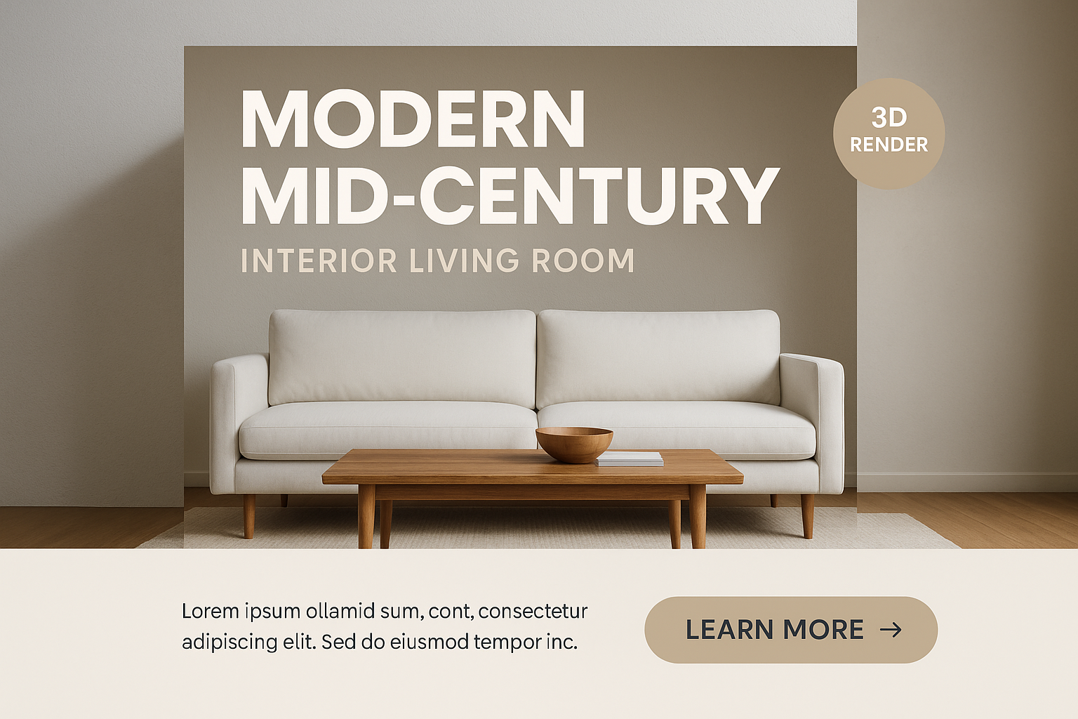 /Collection: /by davooda/Type: PNG/A contemporary mid-century living room featuring a white sofa and wooden coffee table against a soft beige wall. The design emphasizes realism with a clear layout and engaging elements.