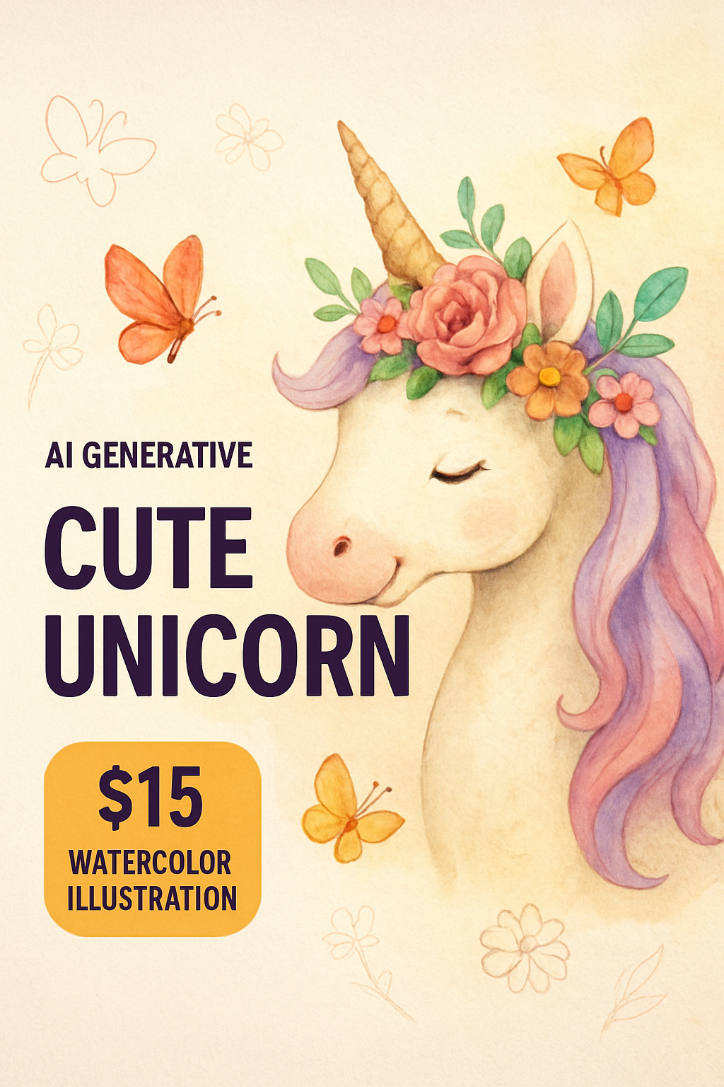 /Collection: /by davooda/Type: PNG/Charming watercolor illustration of a cute unicorn adorned with flowers and butterflies, featuring vibrant colors and bold typography for a modern advertisement layout.