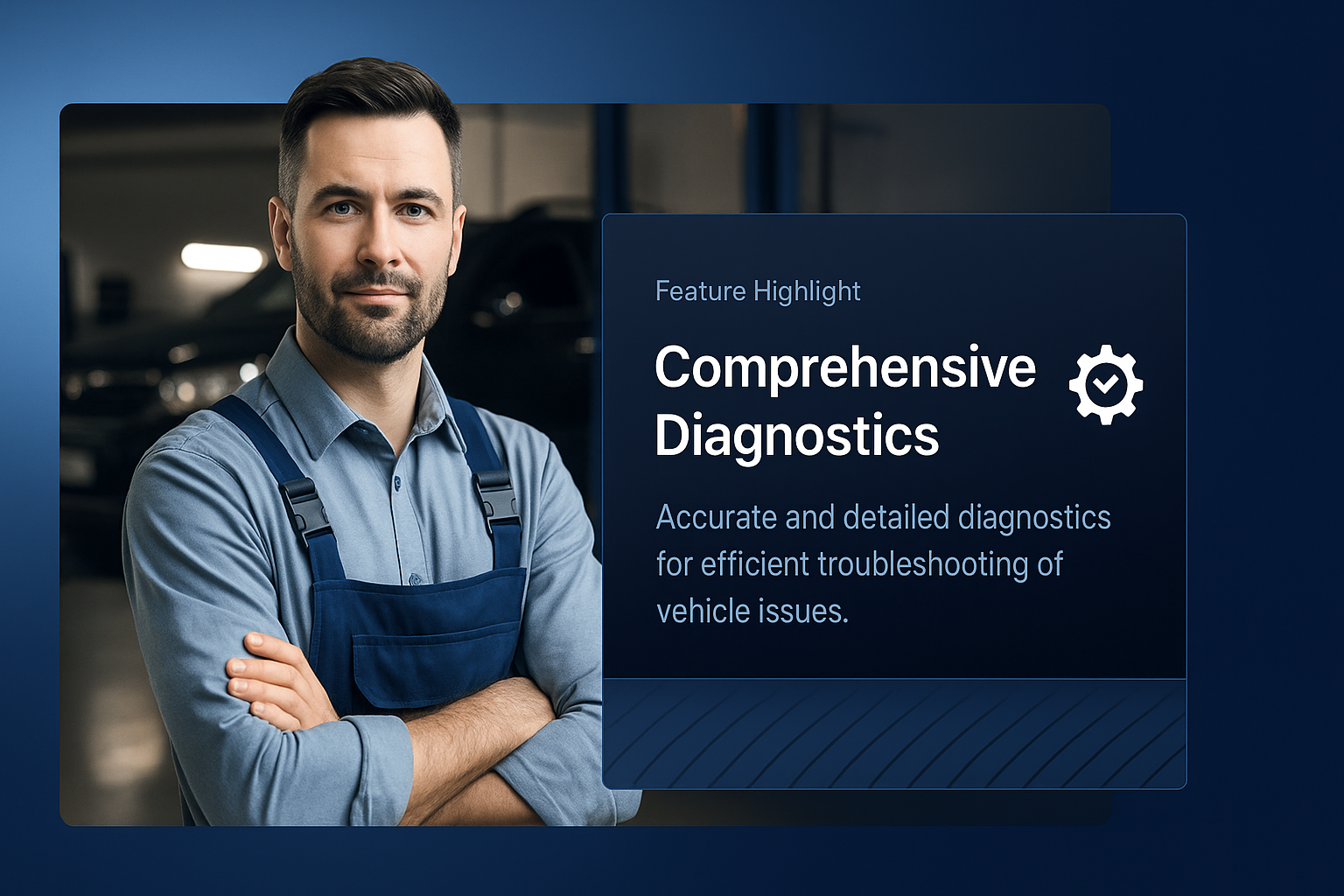 /Collection: /by davooda/Type: PNG/A confident male auto mechanic stands with crossed arms in a sleek, modern auto repair shop. The image highlights diagnostic features with a stylish graphic overlay.