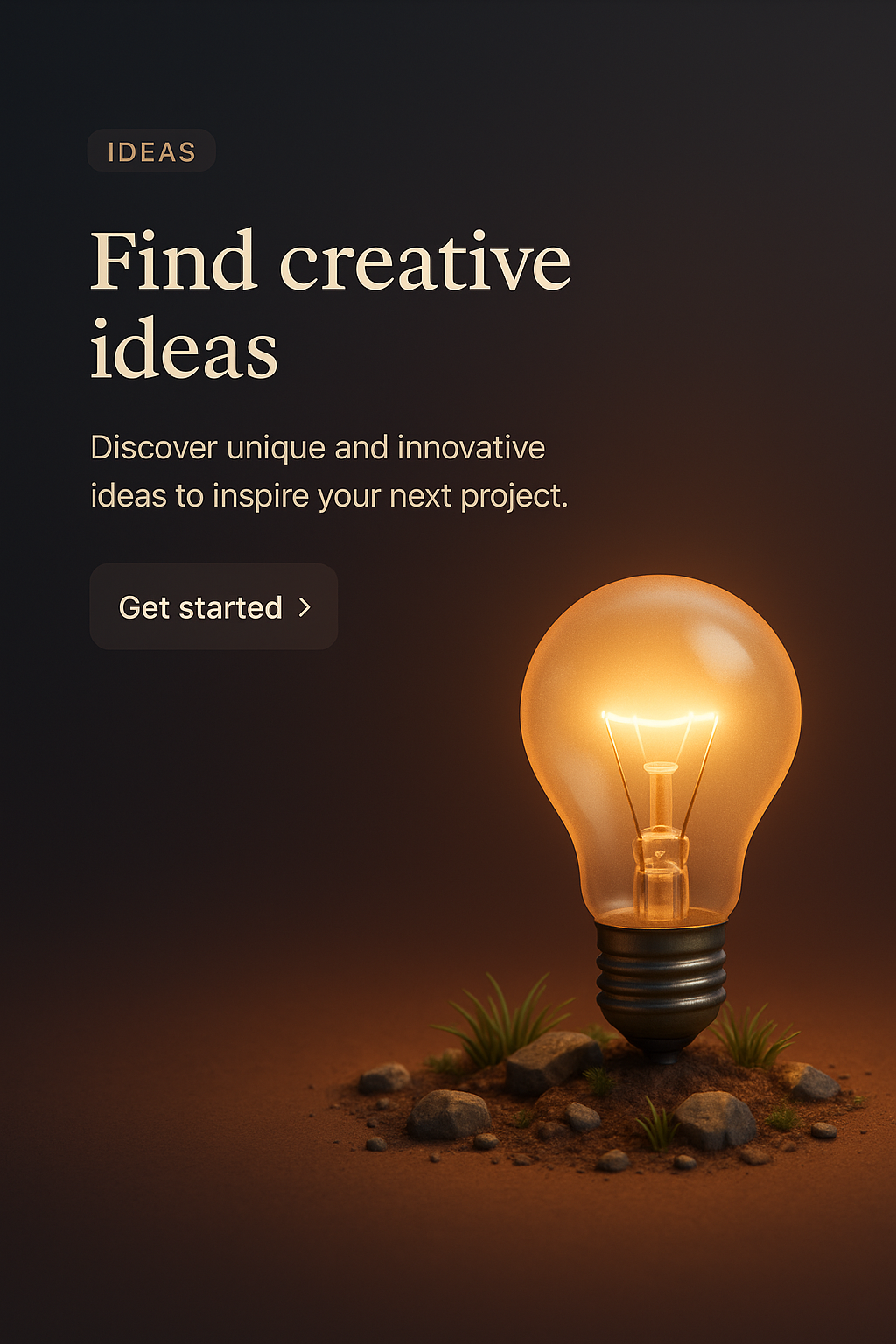 A realistic 3D scene featuring a glowing light bulb surrounded by minimalistic elements against a dark gradient background, promoting creativity and inspiration.