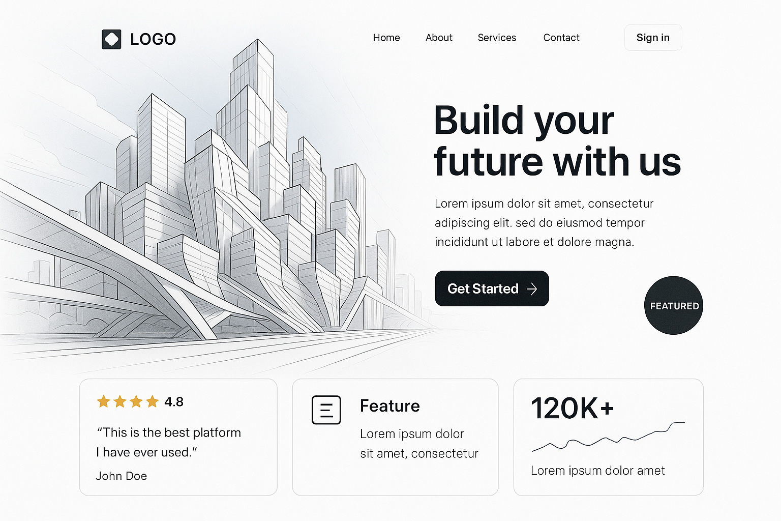 /Collection: /by davooda/Type: PNG/A sleek, modern landing page featuring a 3D illustration of an urban landscape. Includes sections for features, testimonials, and action buttons in a dynamic layout.