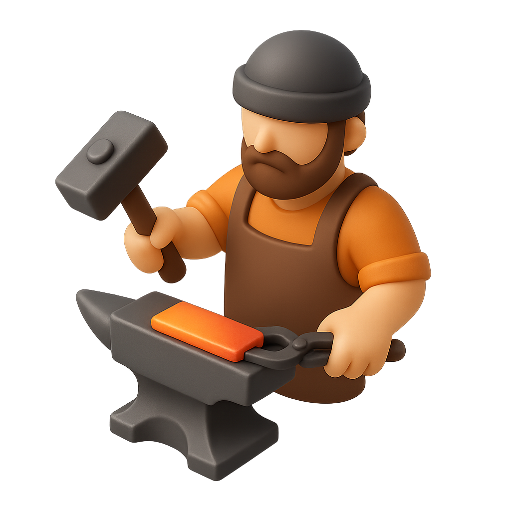 A 3D icon of a blacksmith holding a hammer, with an anvil beside him. The figure has a friendly expression and is designed in a volumetric, isometric style against a transparent background.