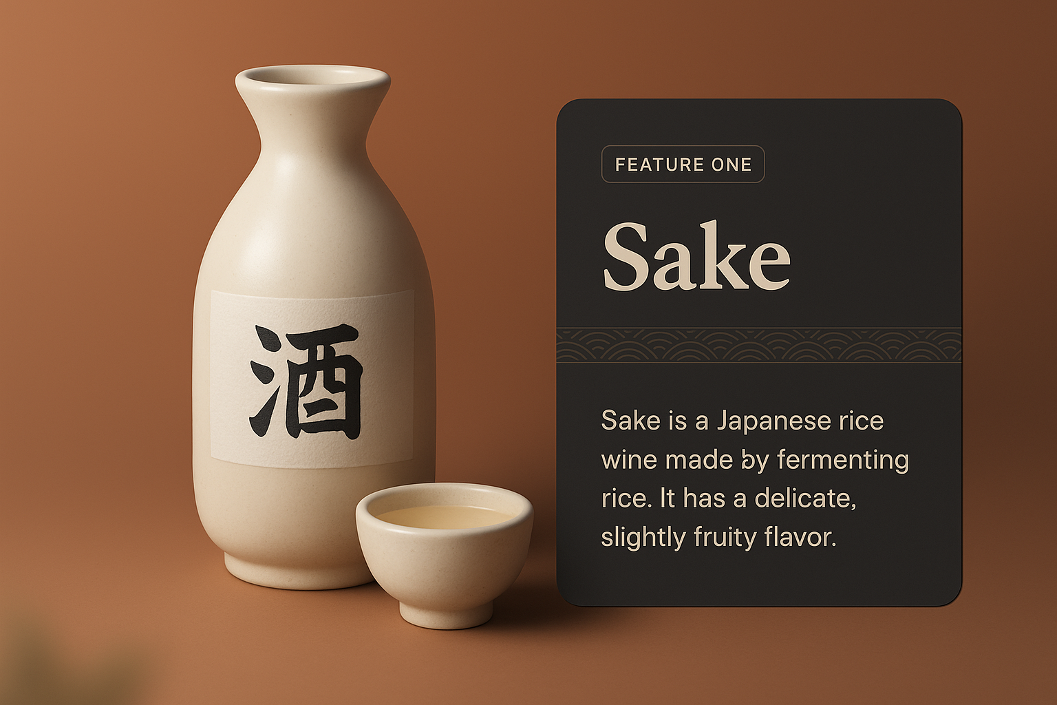 A visually appealing display of sake in a ceramic bottle and cup. The dark panel highlights the sake's features, providing an elegant context for the drink.
