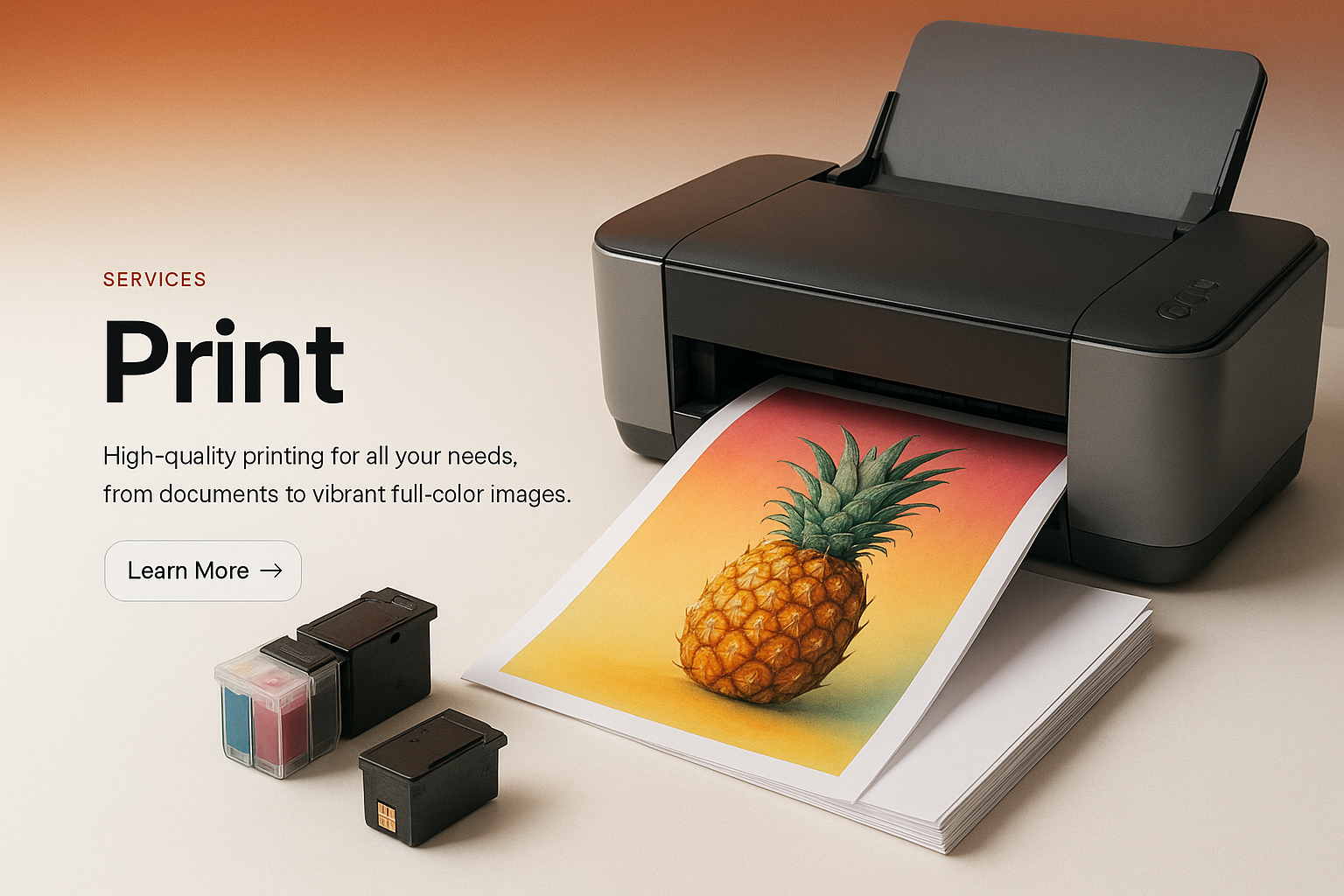 A modern web page mockup showcasing a printer with vibrant color output. Features a clean, minimalistic design with a gradient background and clear typography.