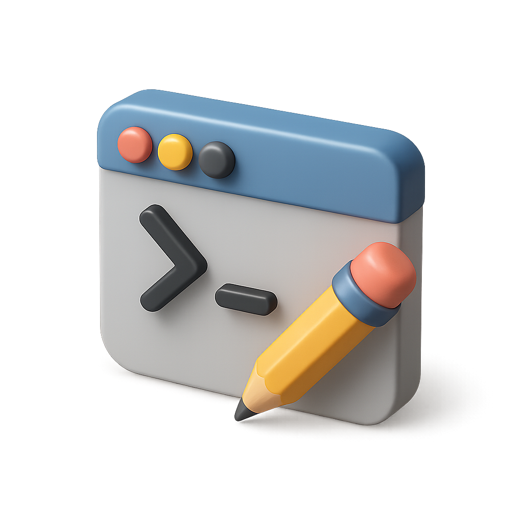 A vibrant 3D icon representing a bash script, featuring a window with a command prompt and a pencil. The design showcases a three-quarter perspective with a smooth, volumetric feel.