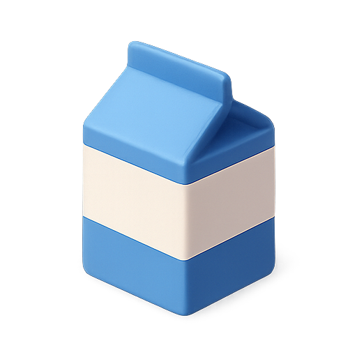 A 3D-rendered, stylized milk carton icon featuring a blue and white color scheme, ideal for use in food-related graphics or apps.
