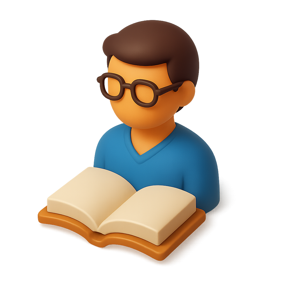 A 3D isometric icon depicting a person with glasses reading an open book. The character has a friendly expression and wears a blue shirt, creating a warm, inviting atmosphere.