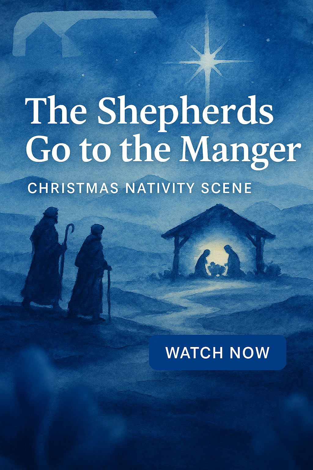 A serene and inviting promotional graphic depicting a Christmas nativity scene, featuring soft watercolor textures and a calming blue color palette, ideal for holiday-themed marketing.