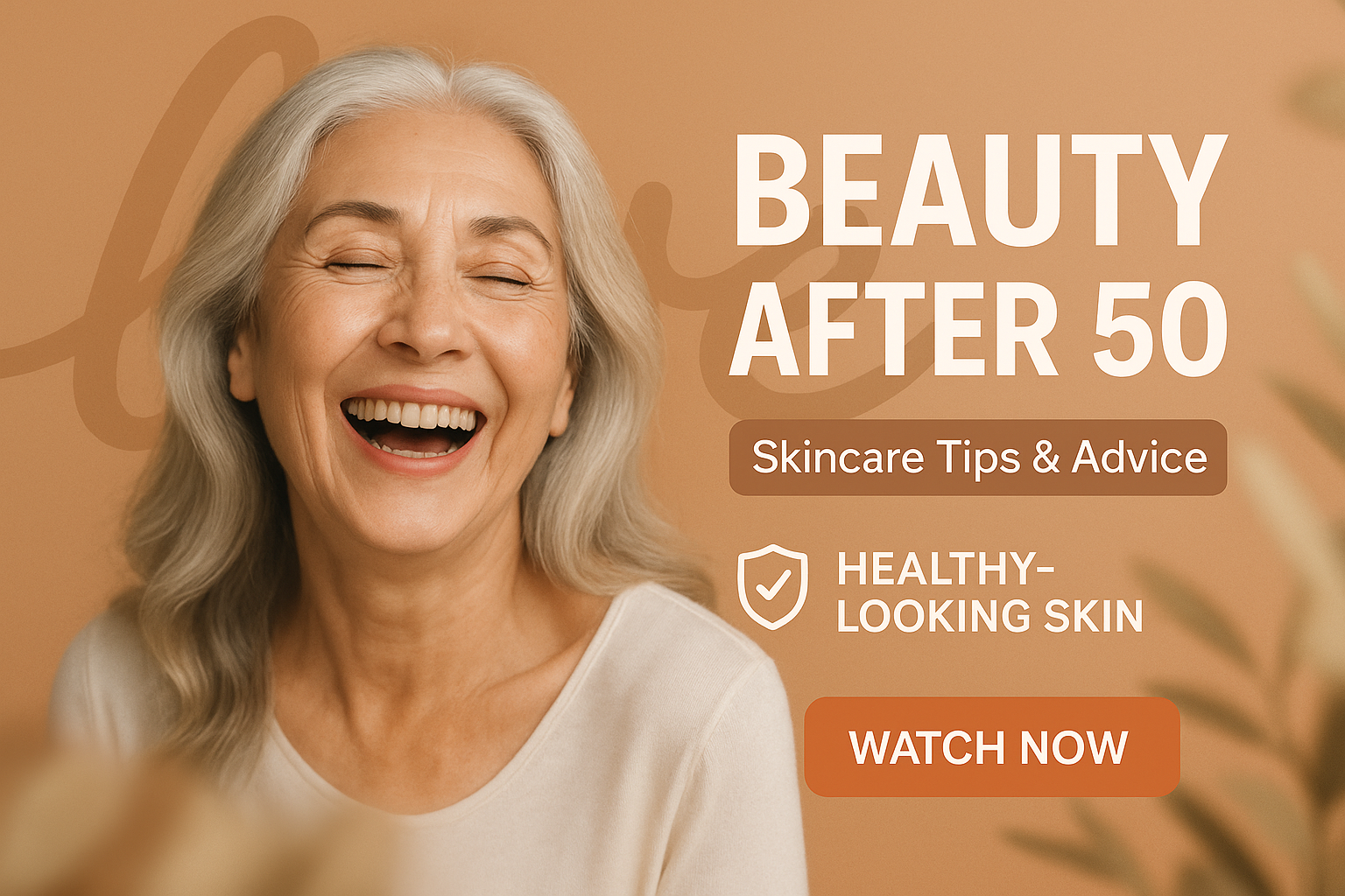 /Collection: /by davooda/Type: PNG/A visually appealing graphic promoting skincare tips for individuals over 50, featuring a smiling woman, warm color palette, and call-to-action elements suitable for social media marketing.