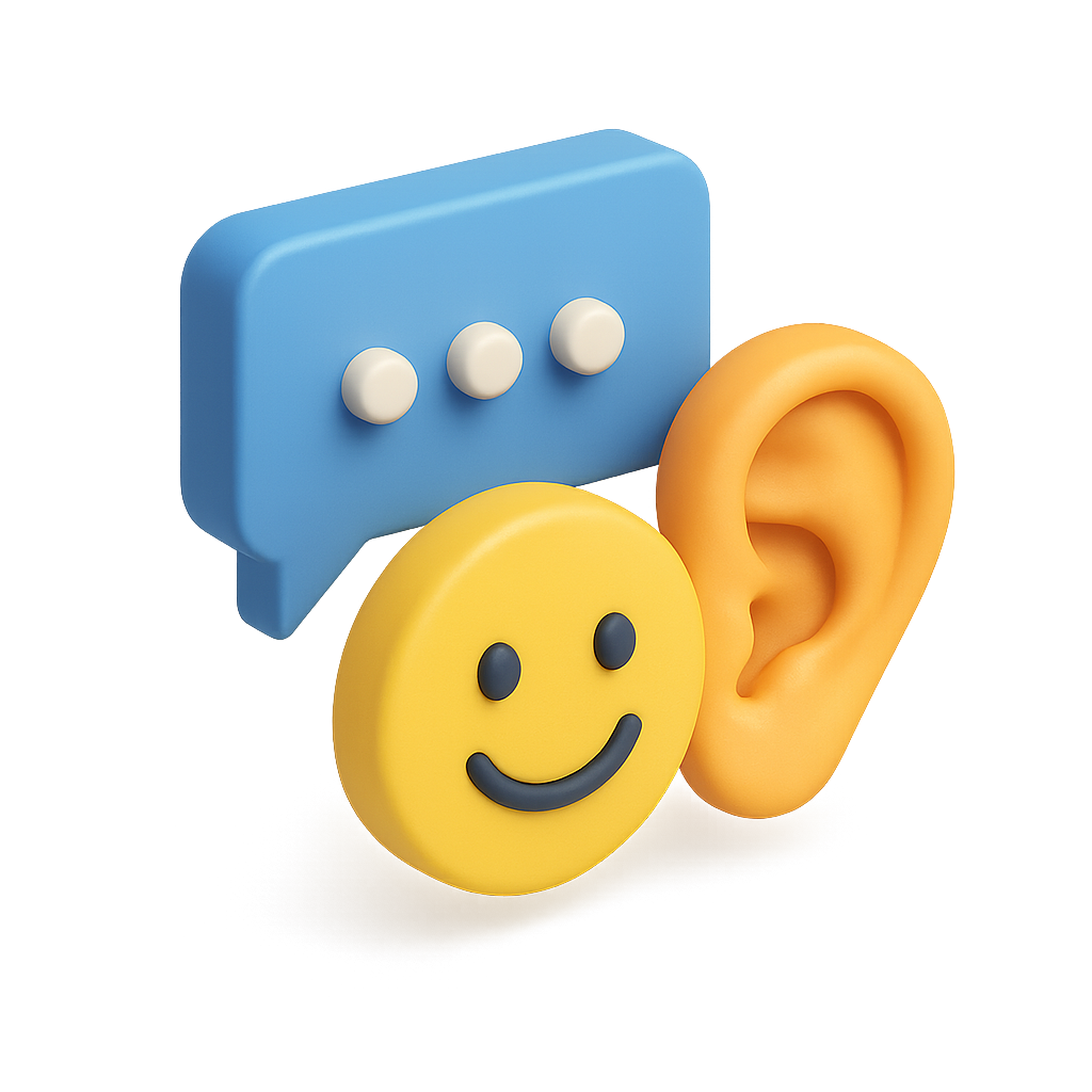 A vibrant 3D icon representing customer feedback. Features a smiley face, an ear, and a speech bubble, all rendered in a cheerful, isometric style.
