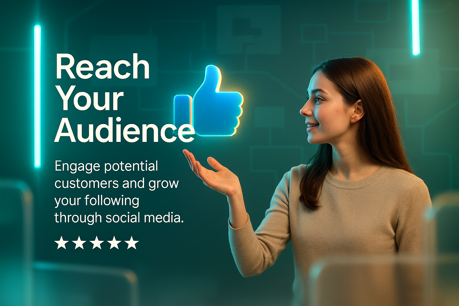 A visually appealing social media post promoting audience engagement, featuring a woman gesturing positively with a modern digital background. Ideal for marketing campaigns.