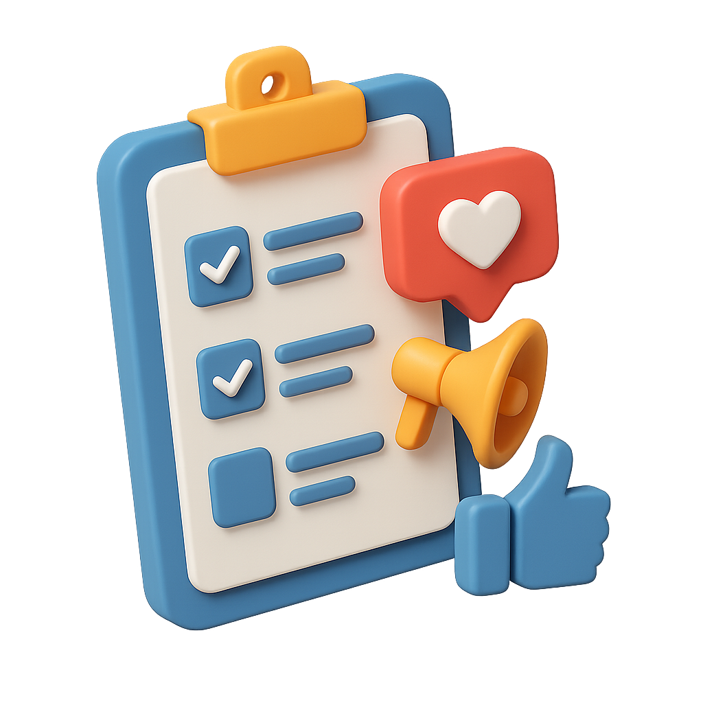 /Collection: /by davooda/Type: PNG/A vibrant 3D icon depicting a checklist on a clipboard, complemented by social media elements like a heart and a megaphone, all designed with an isometric perspective.