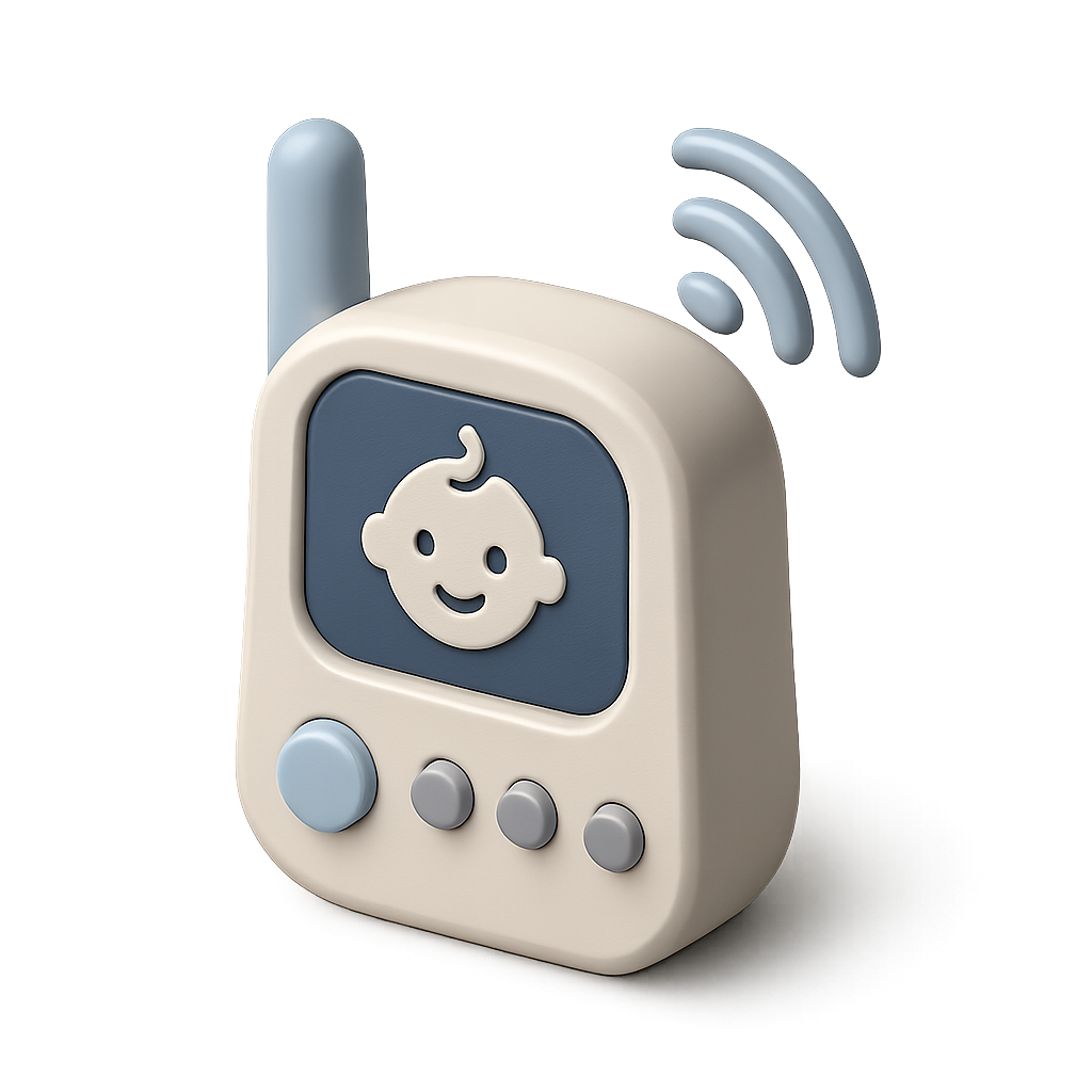 /Collection: /by davooda/Type: PNG/A charming 3D icon of a baby monitor, featuring a smiling baby face, buttons, and an antenna. The design showcases a soft color palette and an isometric view with a transparent background.