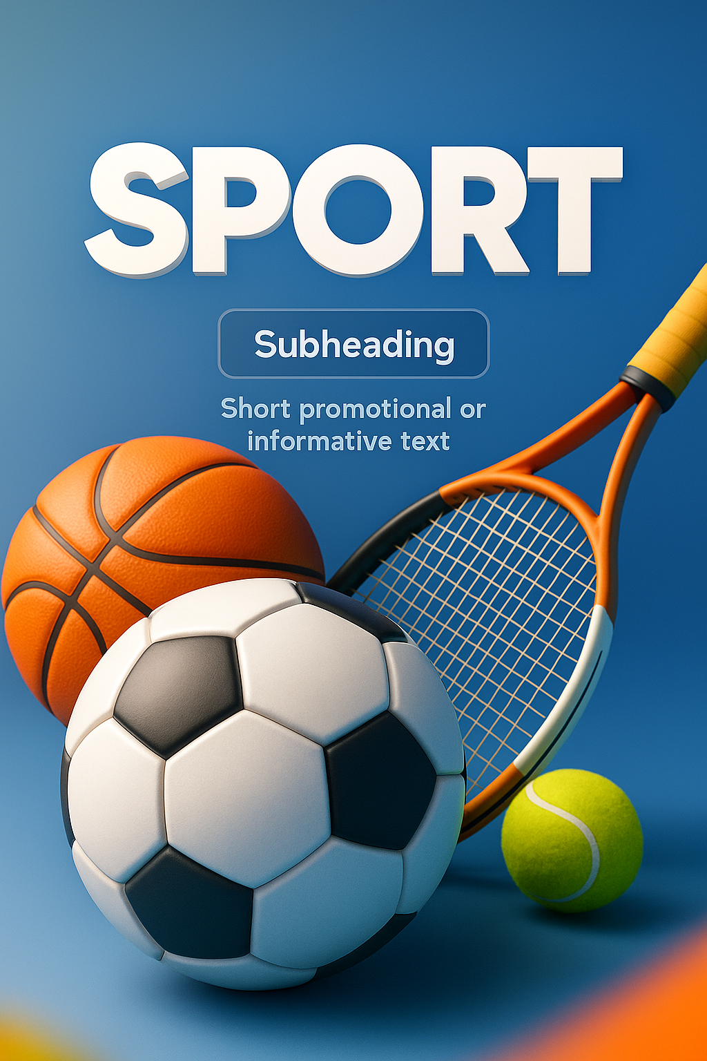 A vibrant 3D depiction showcasing various sports equipment, including a soccer ball, basketball, tennis racket, and tennis ball, set against a smooth gradient background.