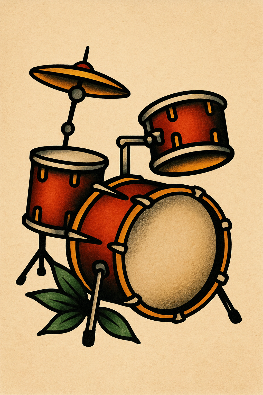 This image features a stylized illustration of a drum set adorned with green leaves. It has a playful and artistic design, suitable for music-themed content.