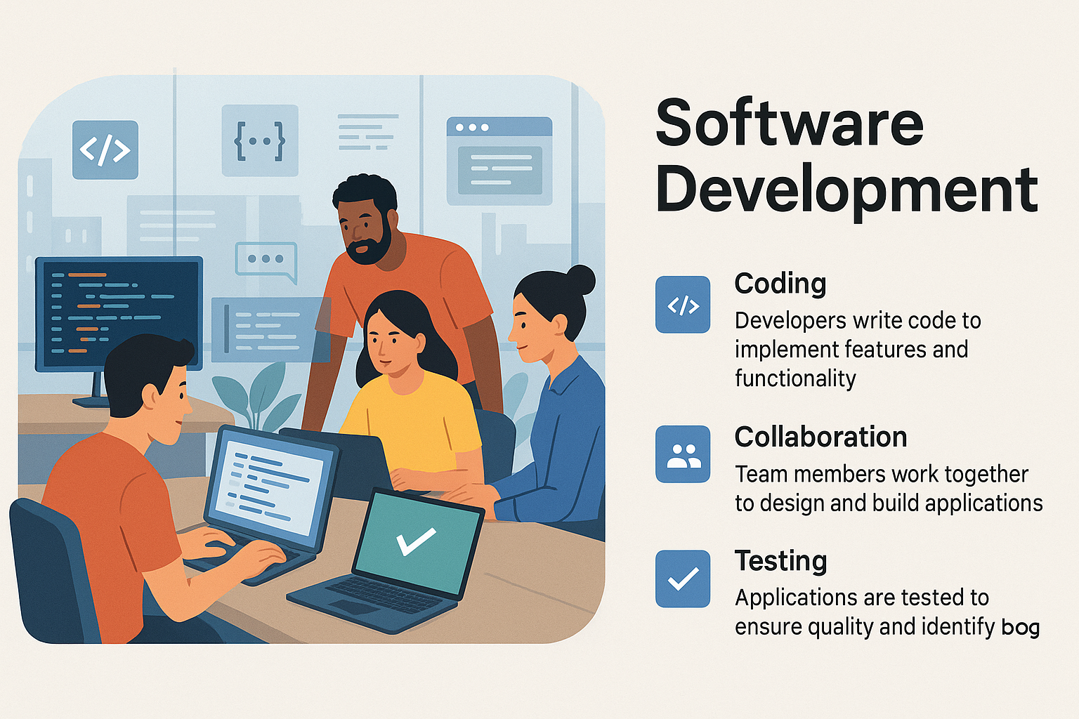 /Collection: /by davooda/Type: PNG/Illustrative graphic depicting a software development team collaborating on coding, testing, and functionality. The design features modern, relatable characters and a clean layout ideal for tech-related content.