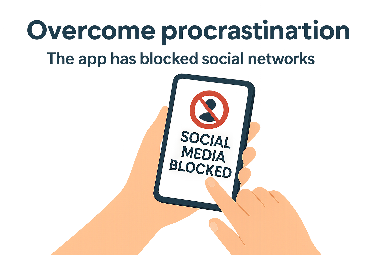 /Collection: /by davooda/Type: PNG/A digital illustration showing a hand holding a smartphone displaying a blocked social media notification. The design aims to convey a theme of overcoming procrastination through technology, suitable for app promotions.