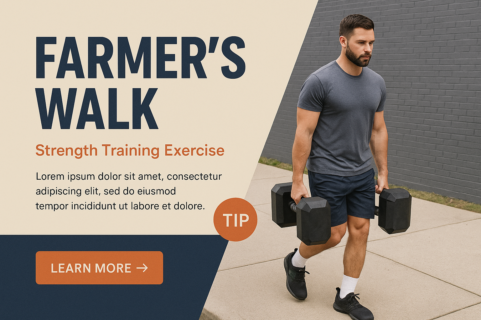 A man performs a farmer's walk, showcasing strength training with dumbbells. The image features a balanced composition with contrasting colors and clear text elements.