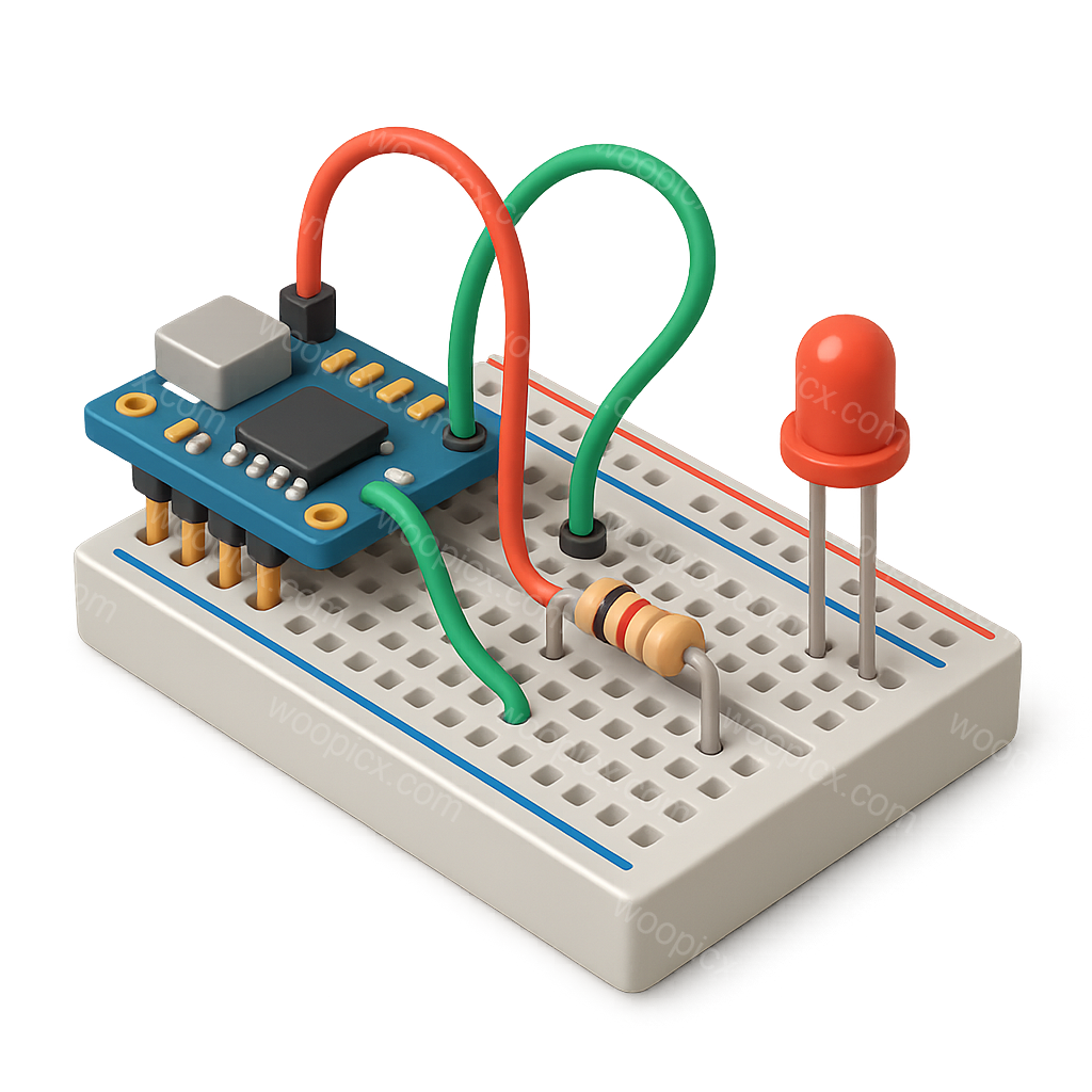 A detailed 3D icon of a breadboard featuring a microcontroller, resistors, and LED. The design showcases vibrant wires and a clean isometric view with a transparent background.