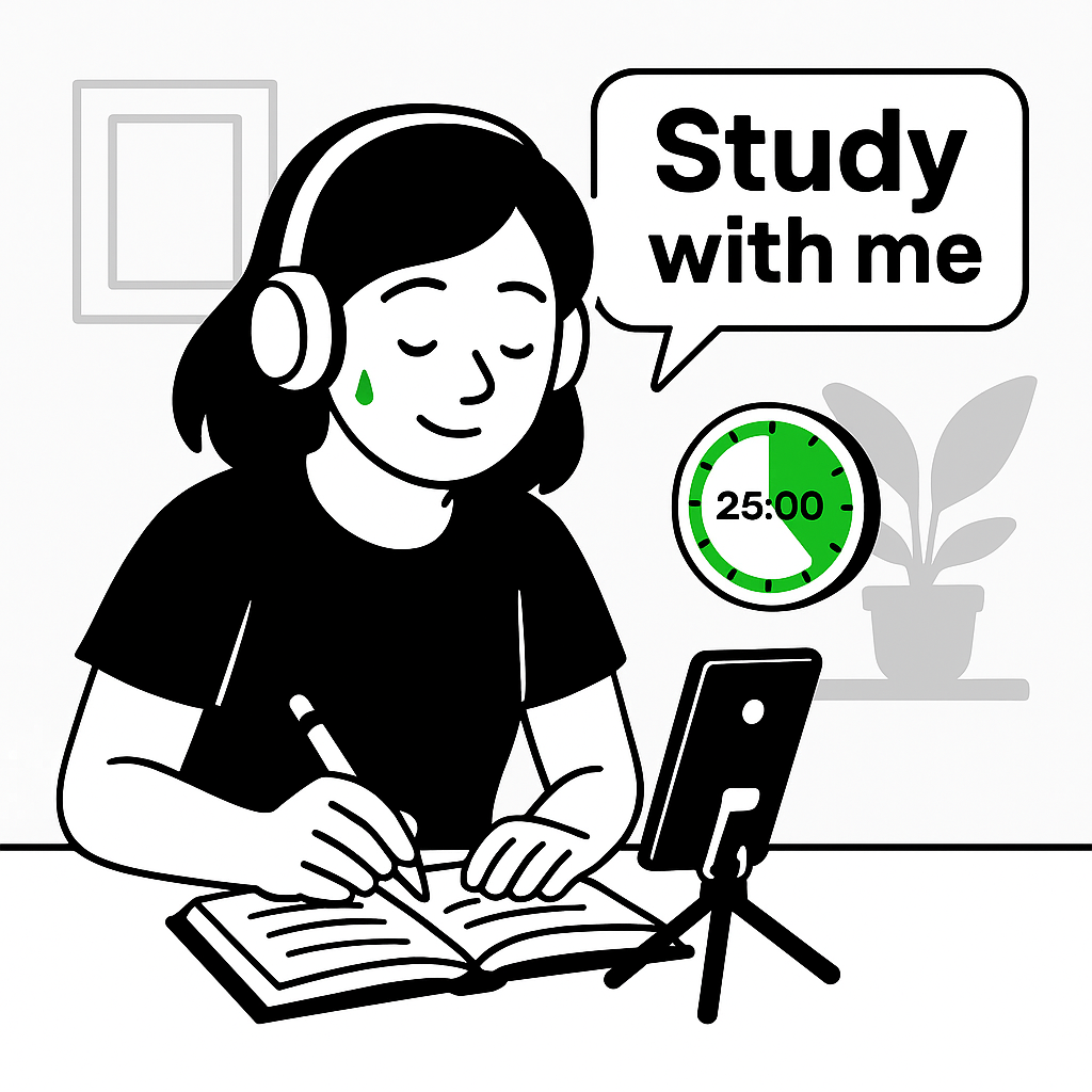 /Collection: /by davooda/Type: PNG/A minimalist illustration depicting a person studying with headphones, a notebook, and a timer. The design is perfect for educational content or productivity themes.