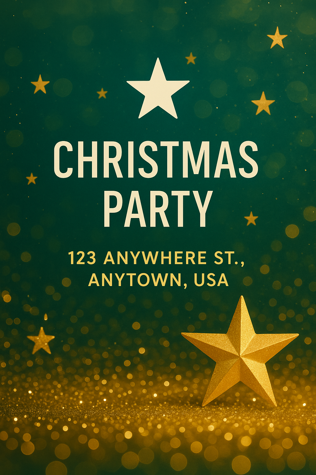 Elegant Christmas party invitation featuring a green background with golden star accents and bokeh effects, ideal for holiday event promotions.
