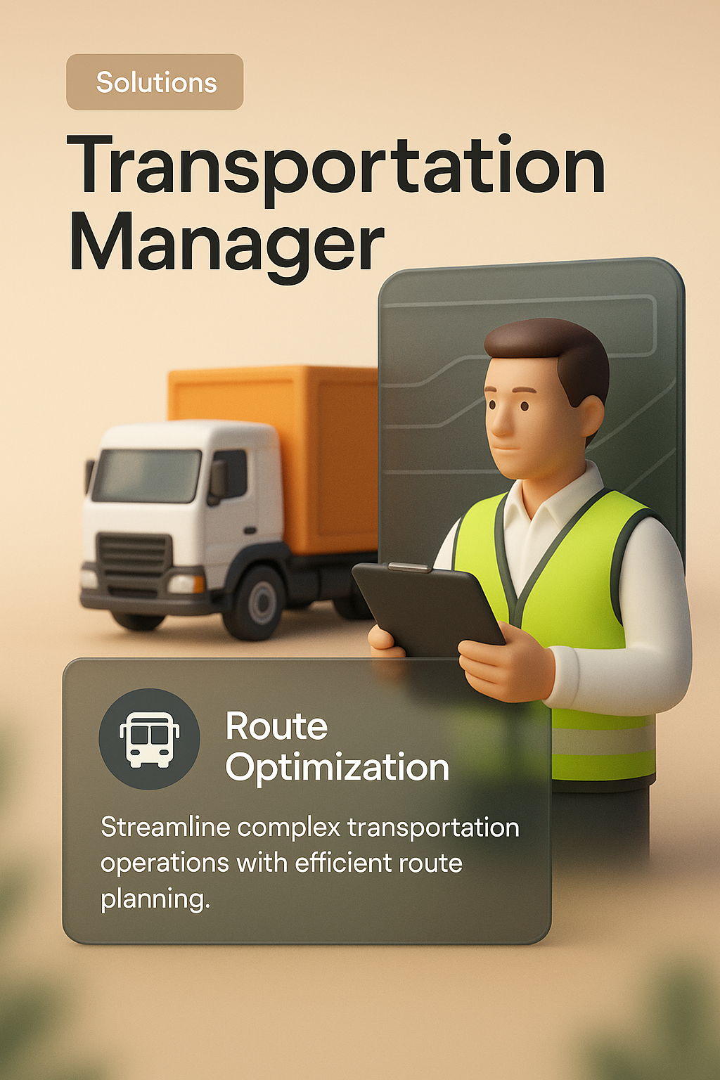 A 3D illustration featuring a Transportation Manager with a truck in the background. It includes a prominent text block with a title, icon, and clear text, integrated into a cohesive design.
