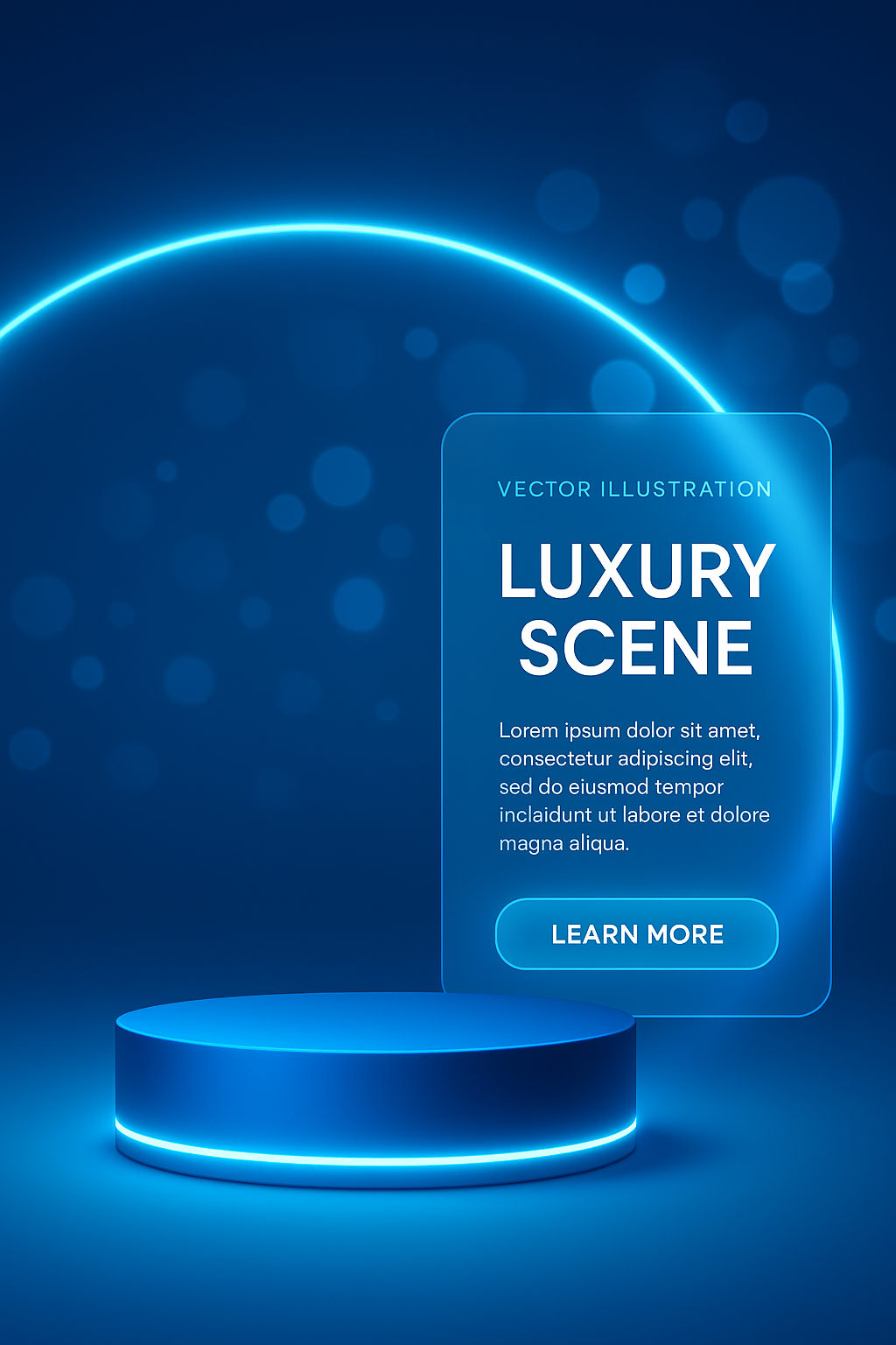 /Collection: /by davooda/Type: PNG/A sleek, empty blue podium illuminated with neon light effects against a dark background. The scene features bokeh decorations and a modern glass panel layout for a luxurious presentation.