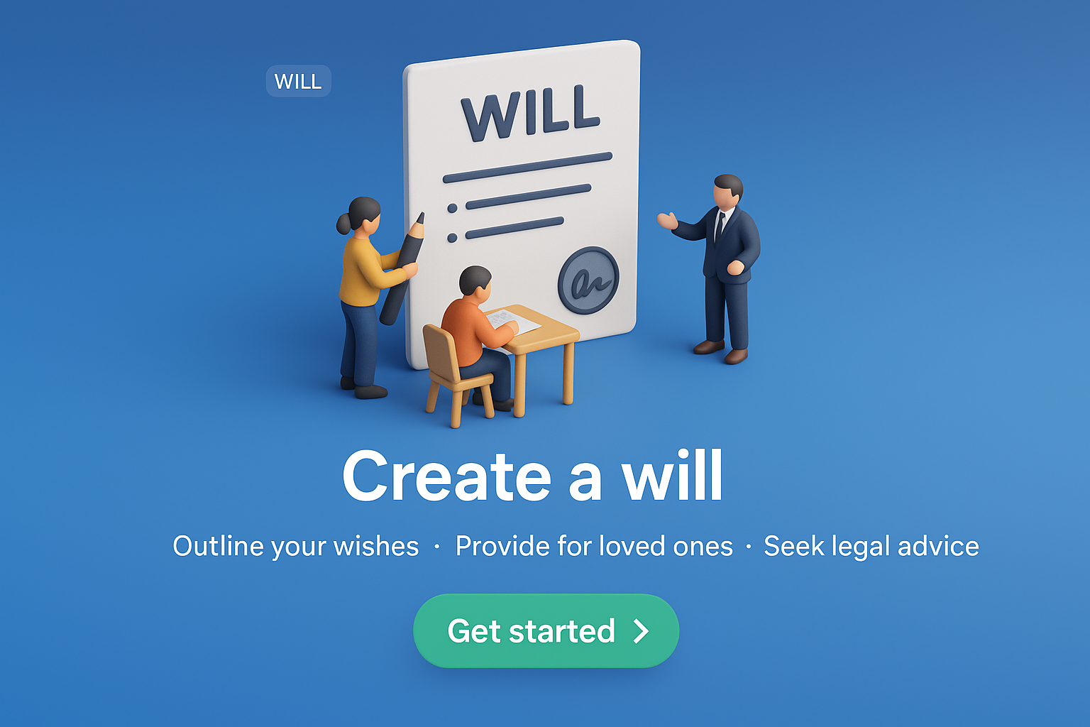 /Collection: /by davooda/Type: PNG/A vibrant 3D scene depicting miniature figures engaged in the process of creating a will. The setting features a gradient blue background with clear text elements encouraging action.