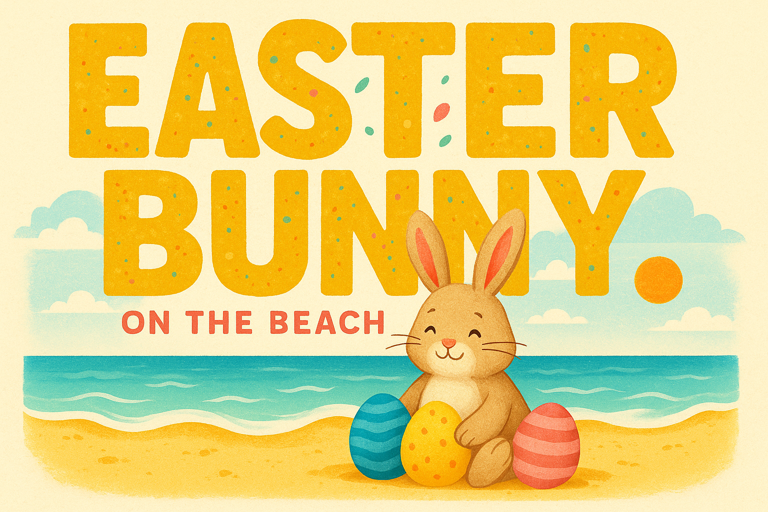 Playful illustration featuring a cartoon Easter Bunny sitting on the beach with colorful eggs. Perfect for Easter-themed events or children's content.
