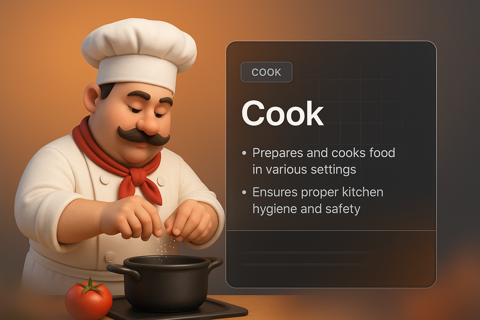 A 3D illustration of a cook preparing food, with a gradient background and an integrated information block detailing the cook's role. The design emphasizes realism and cohesive elements.