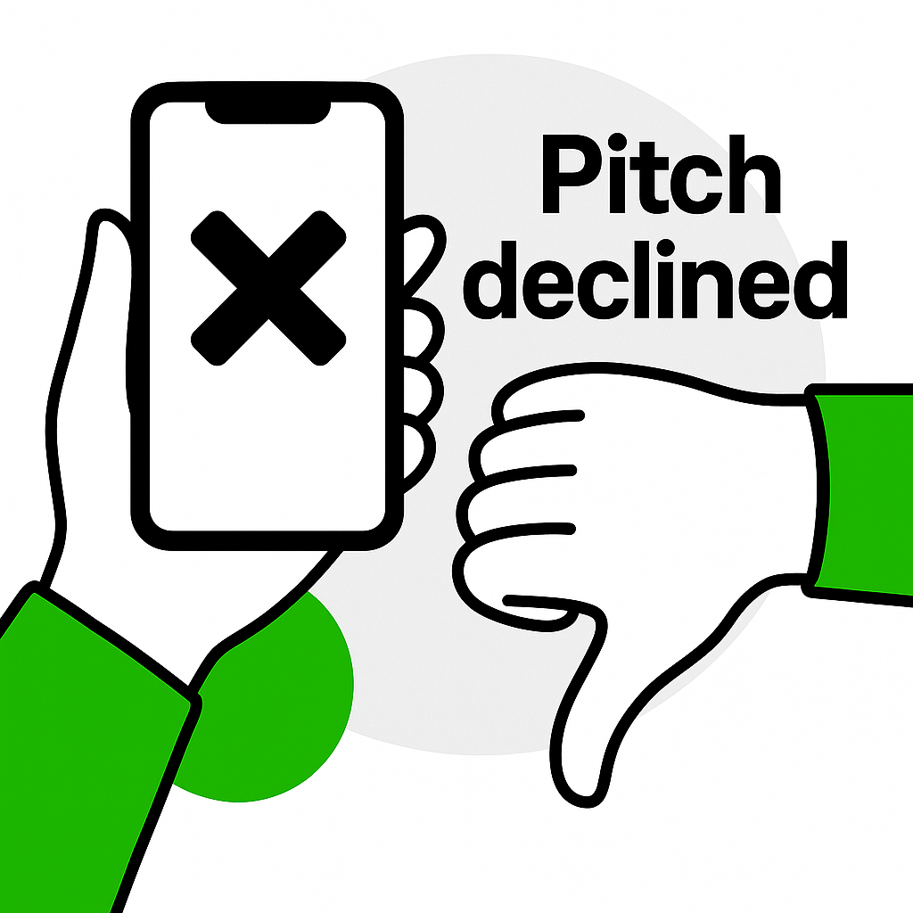 /Collection: /by davooda/Type: PNG/A modern vector-style graphic illustrating a smartphone with a pitch decline message and a thumbs-down gesture, suitable for communication about rejection in business contexts.
