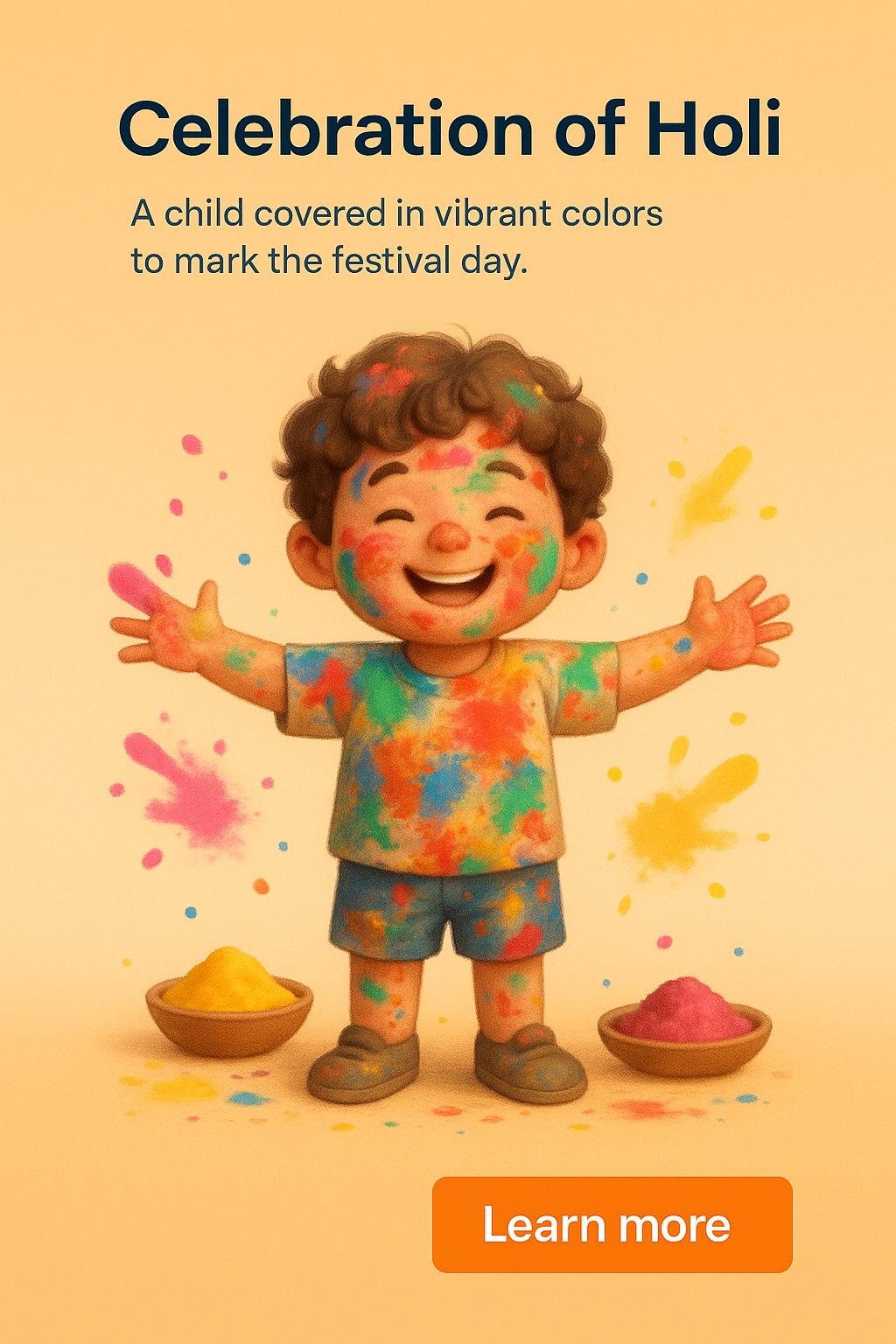 A colorful illustration showcasing a joyful child covered in Holi festival colors, surrounded by bowls of colored powders, celebrating with open arms.