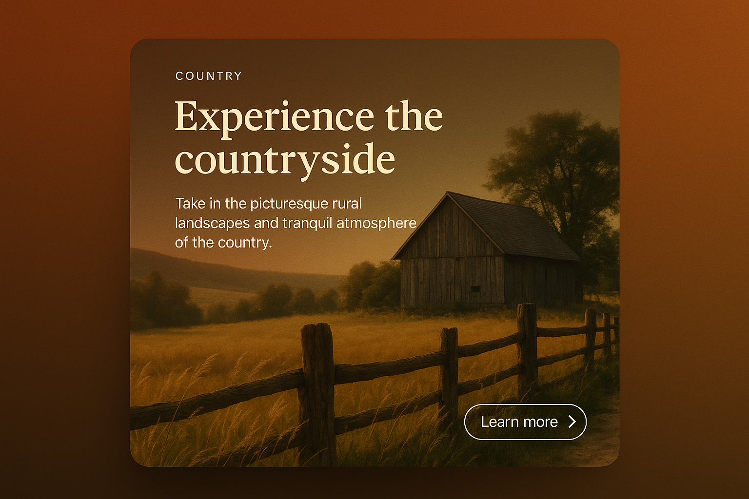 A stylish web page showcasing countryside beauty with a warm gradient background, featuring a wooden barn and a serene landscape, inviting users to explore rural tranquility.