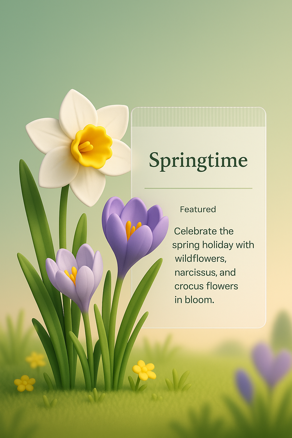 A delightful 3D illustration featuring wildflowers, Narcissus and Crocus blooms, ideal for spring celebrations. The design includes a subtly integrated text block with a spring theme.