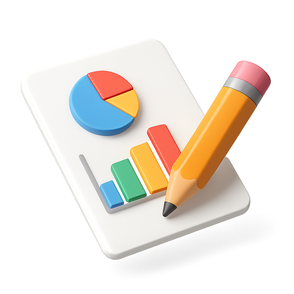 A stylized 3D icon depicting a document featuring colorful graphs and a pencil. The design is vibrant, showcasing a pie chart and bar graph, all set against a transparent background.