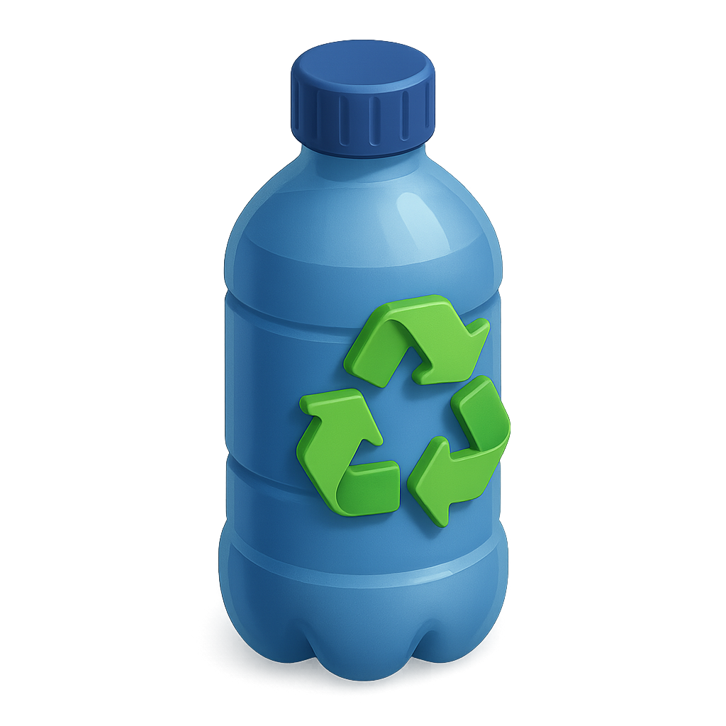 A 3D icon of a blue water bottle featuring a green recycling symbol. The design is presented in a three-quarter view with a transparent background, showcasing a volumetric style.