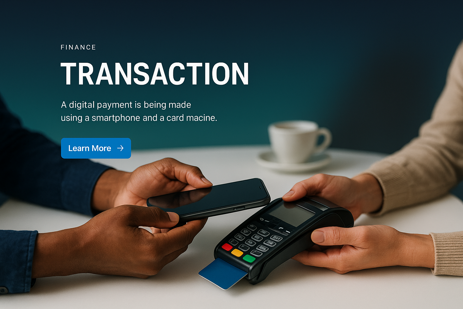 A sleek web design concept showcasing a digital payment transaction with a smartphone and card machine. The background features a gradient, enhancing the focus on the payment process.