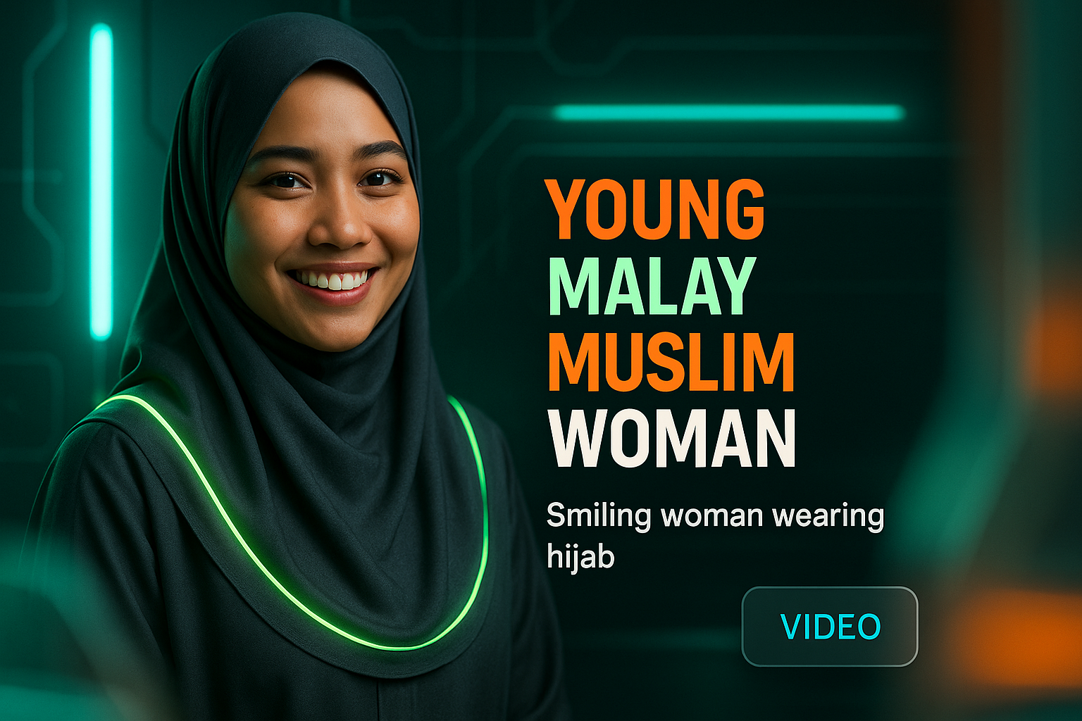 /Collection: /by davooda/Type: PNG/Vibrant portrait of a smiling young Malay Muslim woman wearing a hijab, set against a tech-inspired background. Ideal for content related to diversity and inclusion.