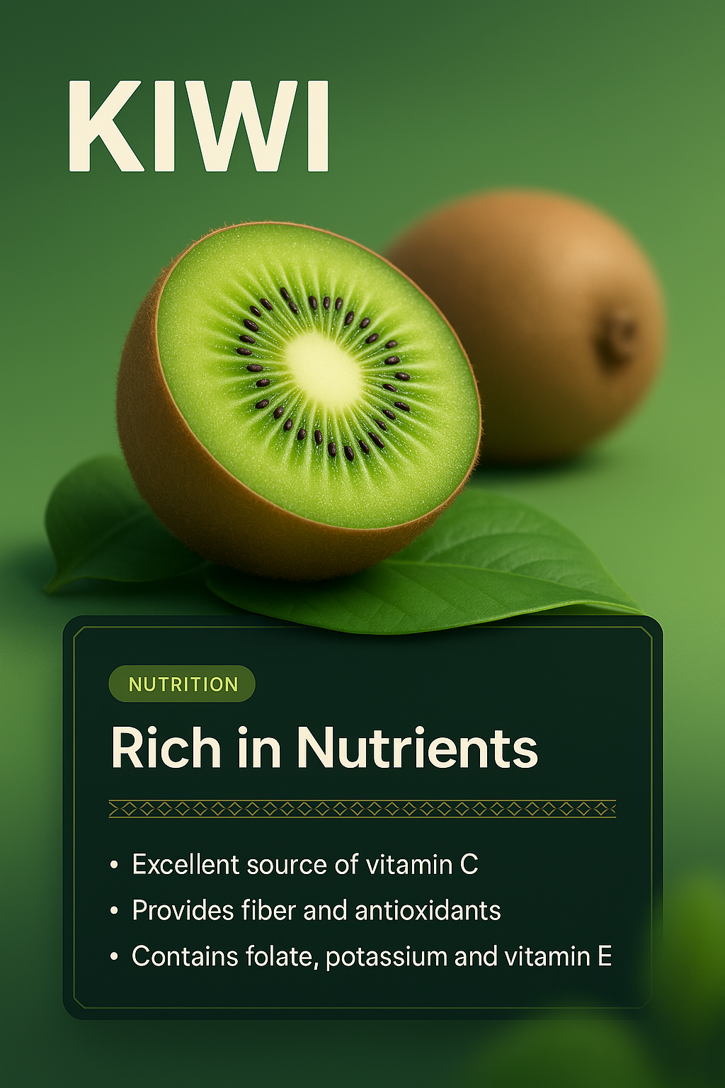 A vibrant 3D illustration of a kiwi fruit, showcasing its inner texture and color, accompanied by a dark panel featuring nutritional information.