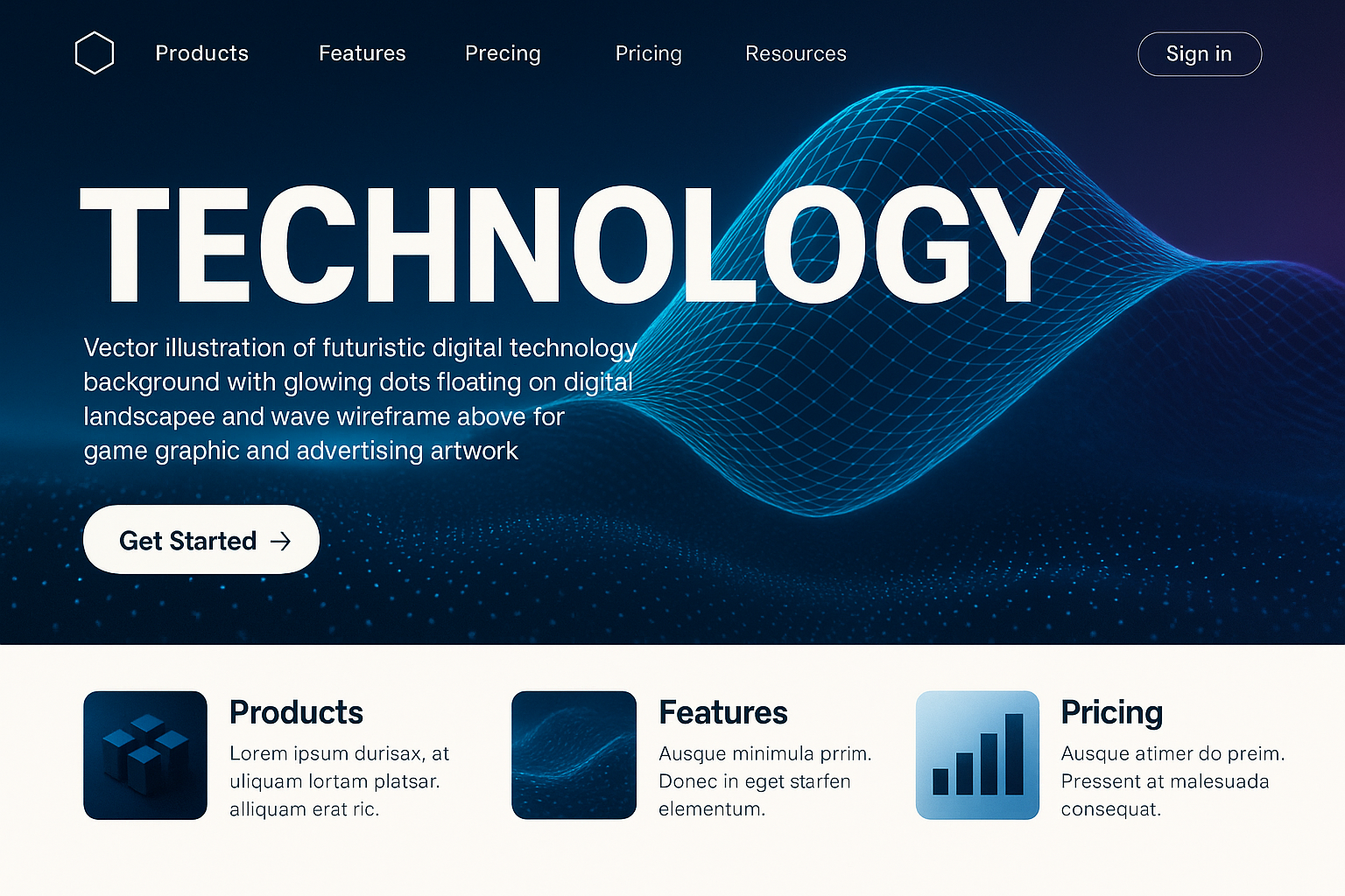 /Collection: /by davooda/Type: PNG/A dynamic and modern landing page design featuring a futuristic technology background, glowing dots, and a wave wireframe. The bold typography and structured layout create a cinematic feel.
