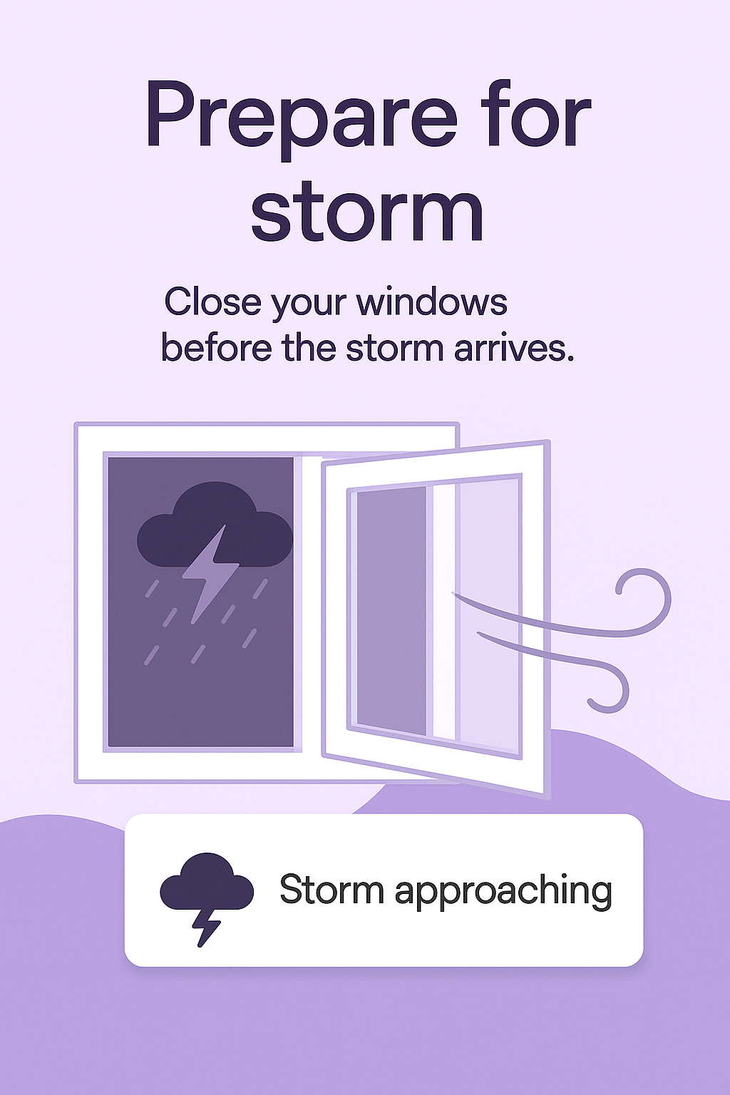 /Collection: /by davooda/Type: PNG/A visually engaging graphic illustrating storm preparation advice, featuring a window scene with storm elements. Ideal for safety awareness campaigns and educational materials.