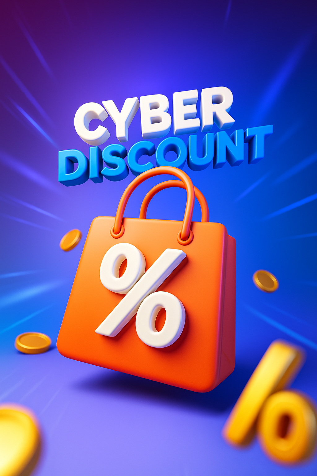 /Collection: /by davooda/Type: PNG/A vibrant illustration showcasing a shopping bag with a percentage symbol, emphasizing a cyber discount theme. The dynamic background features a gradient transitioning from blue to purple, enhancing the energetic feel.