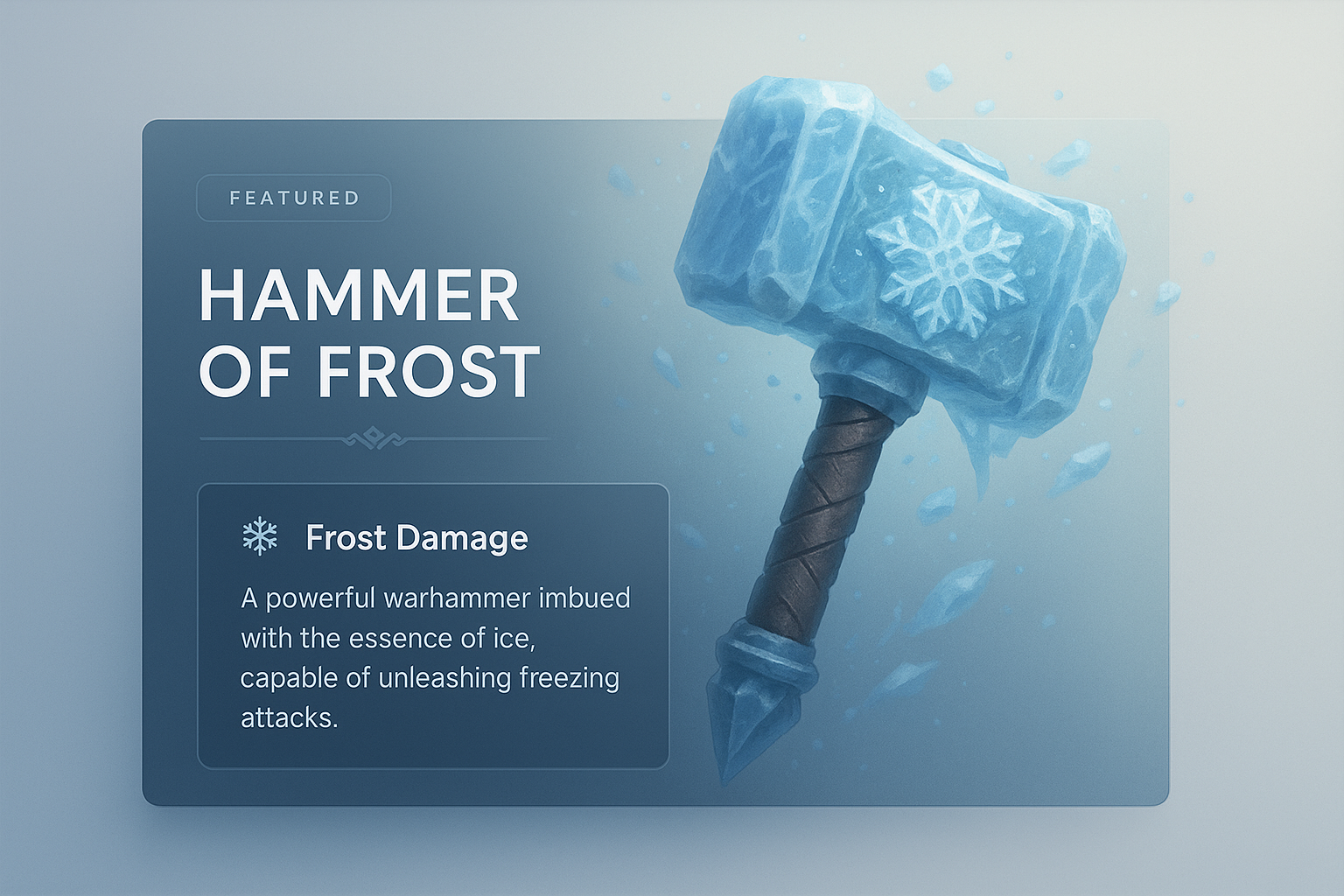 /Collection: /by davooda/Type: PNG/A visually striking 3D illustration of a frost-themed warhammer. The design integrates a sleek panel featuring a title, icon, and description about its abilities, all set against a smooth gradient background.