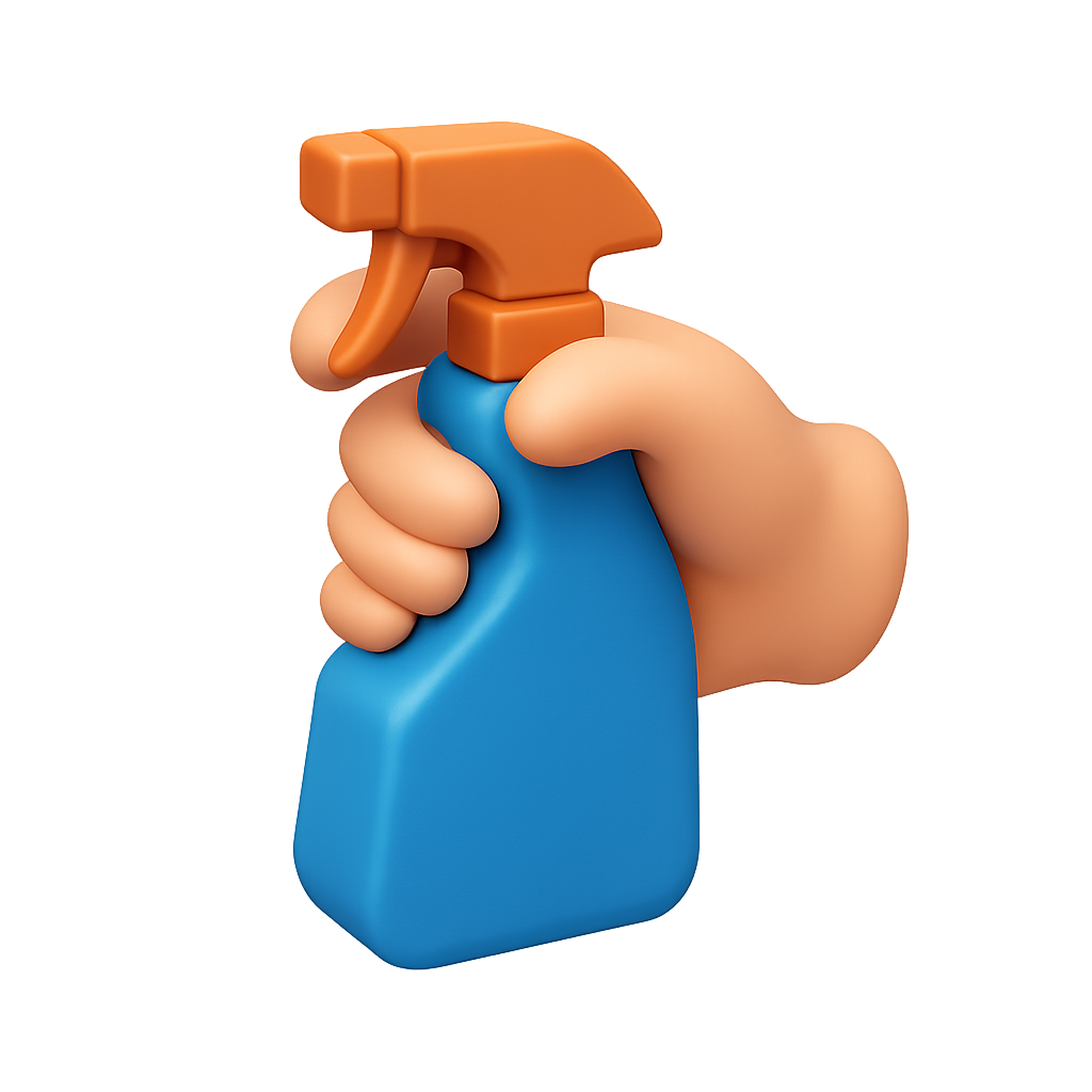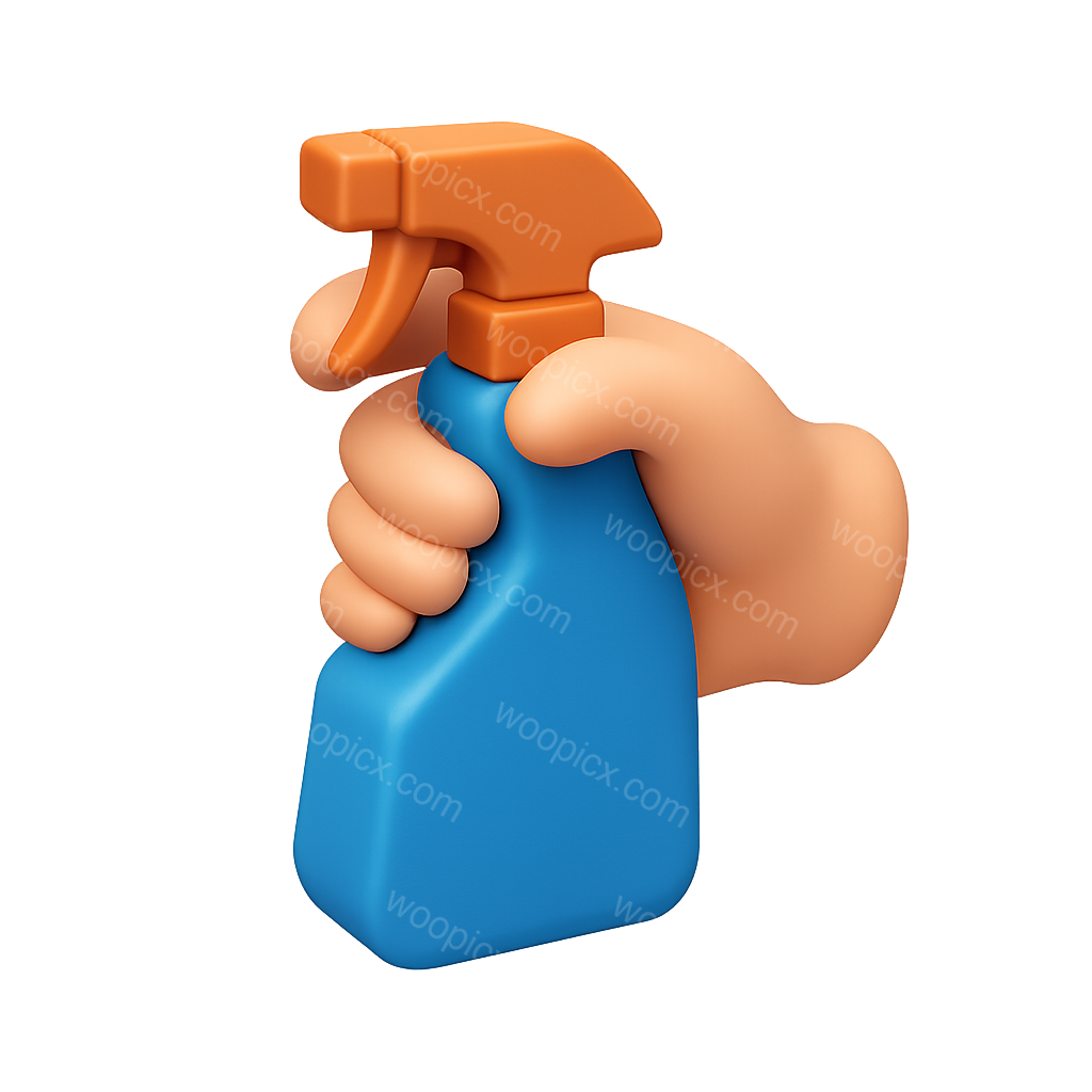 A vibrant 3D illustration of a hand gripping a spray bottle, featuring a blue body and an orange nozzle. The design is isometric with a transparent background, emphasizing its volumetric qualities.