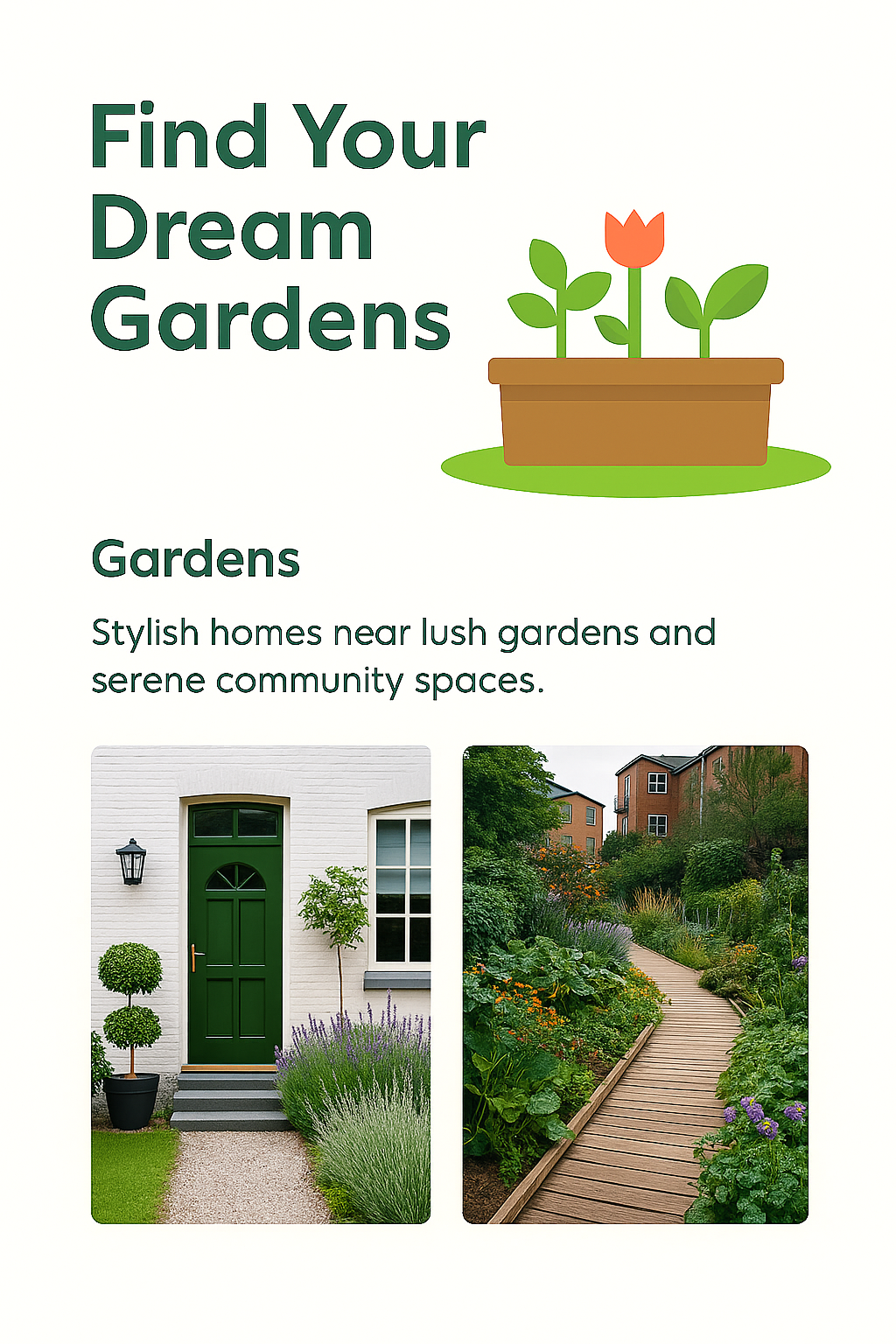 A visually appealing promotional graphic showcasing stylish homes adjacent to lush gardens, ideal for real estate marketing. Features modern typography and vibrant imagery.