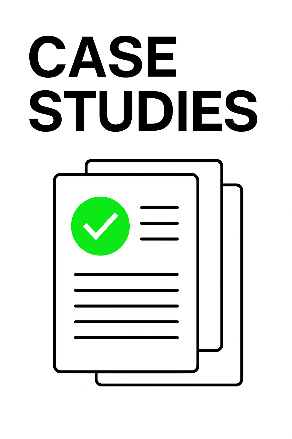 Simple and modern graphic illustrating case studies with document icons and a checkmark, suitable for educational or marketing materials.