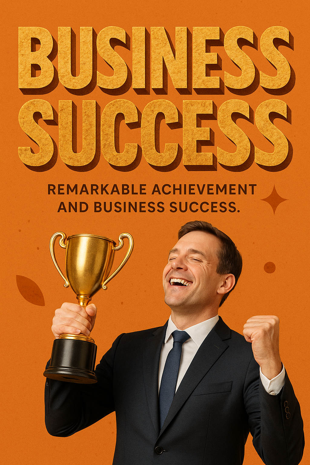 Vibrant graphic celebrating business success, showcasing a man holding a trophy with bold typography. Ideal for motivational content and business-related media.