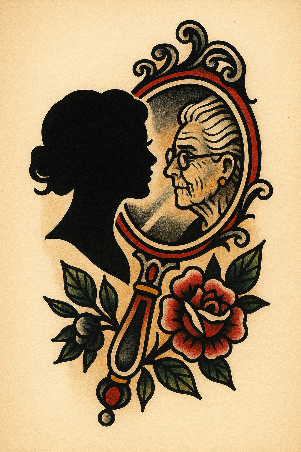 /Collection: /by davooda/Type: PNG/A striking tattoo design featuring a silhouette of a woman looking into a mirror. The reflection shows an elderly woman, surrounded by ornate decorations and roses on a beige background.